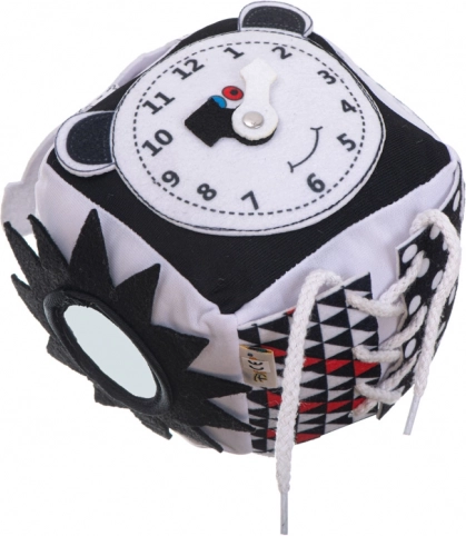 Ova mekana senzorička kocka učinit će svaki dan vašeg malog istražitelja izvanrednim. Kontrastni uzorci i crno-bijele boje stimuliraju vid, dok različite teksture pomažu u razvoju dodira. Kocka je opremljena zvečkom i šuškavim elementima koji privlače sluh čak i onih najmanjih.