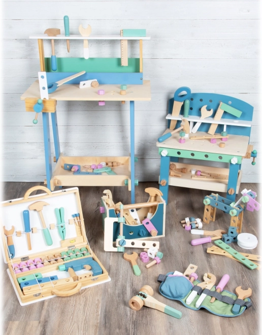 Njegovo pouzdano metalno zatvaranje i ručka prilagođena dječjim rukama omogućuju lako prenošenje. Set je izrađen u kombinaciji šperploče i masivnog drva, čime nudi visoku trajnost i niz korisnih poboljšanja. Djeca mogu birati između različitih dekorativnih stilova: radionica Miniwob i skandinavski Nordic.