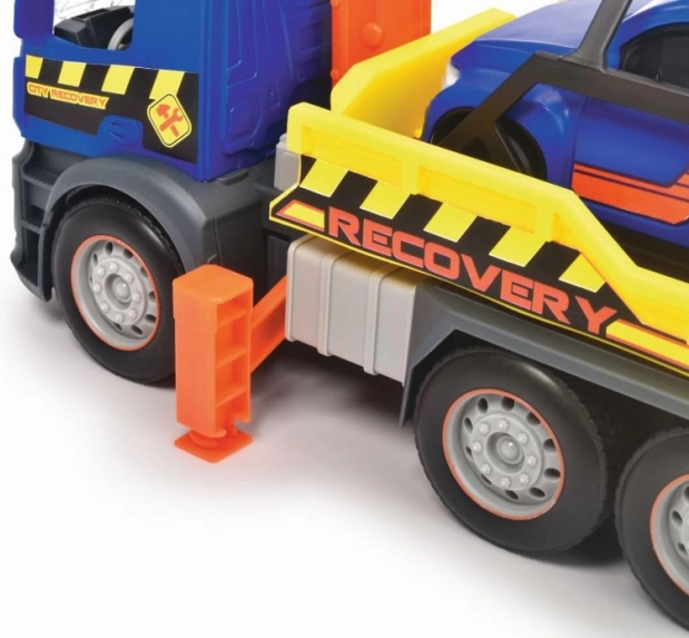 Funkcionalni dijelovi, poput pokretnog podizača (dizalice) i preklopne teretne platforme, omogućuju lako ukrcavanje i osiguravanje priloženog automobila. Idealno za kreativnu igru u gradu, razvoj motorike i mašte.