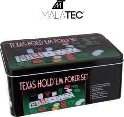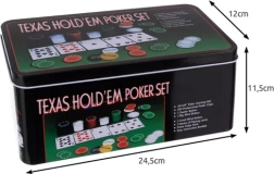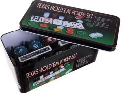 Kompletan poker set TEXAS HOLD’EM u praktičnoj metalnoj kutiji sadrži 200 žetona s različitim apoenima, 2 špila karata, set funkcionalnih žetona (Dealer, Small Blind, Big Blind) i zelenu igraću podlogu. Sve je pregledno pohranjeno u stalču za žetone, koji osigurava red i jednostavno prenošenje.