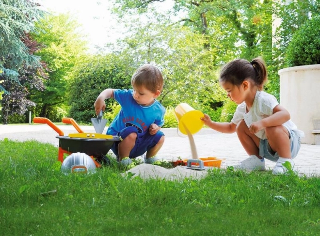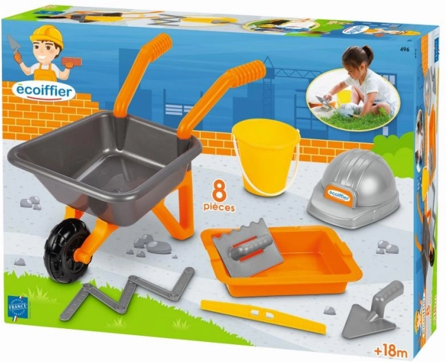 Super set za pješčana gradilišta, 8-dijelni. Tačke, kanta, libela, sklopivi metar, zidarska žlica, gleter, posuda i zaštitna kaciga.