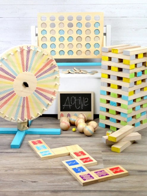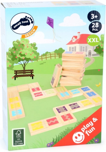 Domino XXL Active od small foot bezvremenska je društvena igra u maxi izdanju koja zabavlja djecu i odrasle. Svaka pločica izrađena je od 100% FSC certificiranog drva i ukrašena je živim bojama i šrafiranim uzorcima. Igrati se možete prema bojama ili prema šrafiranju – djeca tako vježbaju vizualno razlikovanje, koncentraciju i strateško razmišljanje.