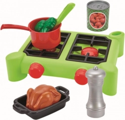 S ovim kompletnim setom posuđa djeca mogu uživati u beskrajnim satima kuhanja. Set uključuje lonce s poklopcima, tave, tiganj, pekač i razne namirnice koje doprinose realističnosti.