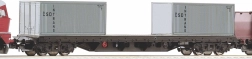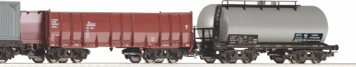 Set uključuje platforme s kontejnerima, otvoreni vagon i cisternu za autentičan mješoviti teret i raznolike sastave.