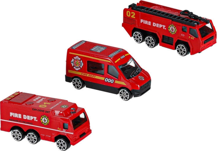 - 3 crvena vatrogasna vozila: vozilo s ljestvama, oklopni transporter, gradsko vozilo