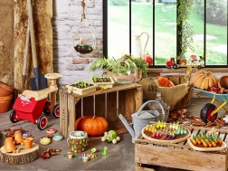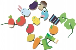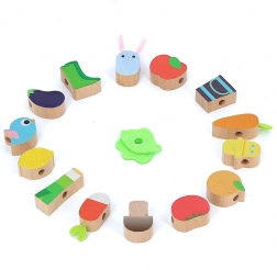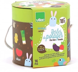 Set od 14 ilustriranih perli (npr. patlidžan, rajčica, ptičica, gumene čizme) potiče maštu, učenje boja i imenovanje.