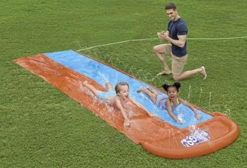 Uživajte u ljetu do kraja s dvostrukim vodenim toboganom H2O GO! marke Bestway, duljine 4,88 m. Dvije staze za utrkivanje, integrirane vodene mlaznice za maksimalnu klizavost i mekani napuhujući završetak osiguravaju sigurnu i beskrajnu zabavu u dvorištu.