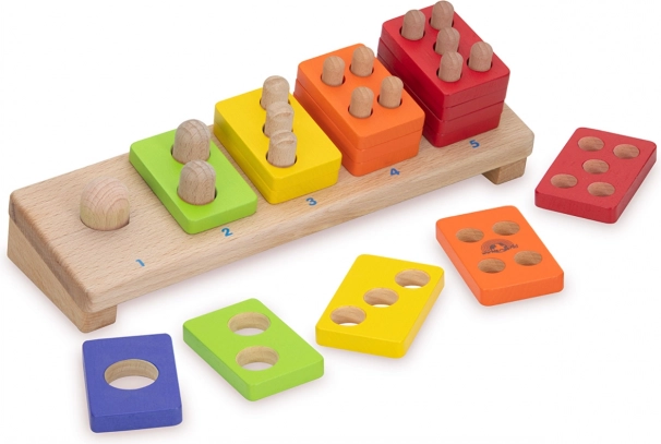 Svaki šareni dijelić ima broj otvora koji odgovara broju na postolju. Djeca tako prirodno uvježbavaju brojeve 1–5 i uspoređivanje količina.