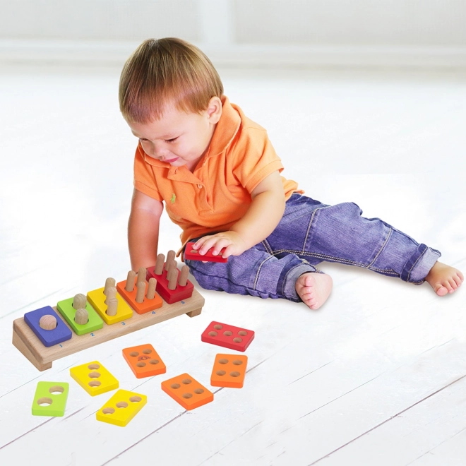 Ova kvalitetna drvena edukativna igračka djecu na prirodan način uči prepoznavati boje i razumjeti redoslijed brojeva 1–5. Svaka pločica ima odgovarajući broj otvora, a djeca ih nižu na štapiće u postolju, čime vježbaju brojanje i logičko razmišljanje.