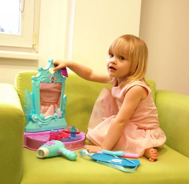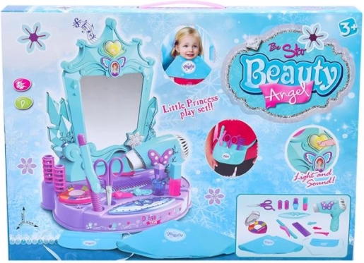 Ovaj stilski toaletni set u tirkizno-ljubičastoj kombinaciji boja donosi djeci sate stvaralačke zabave. Glavna atrakcija je zrcalo sa svjetlosnim i zvučnim efektima – nakon aktivacije pokreće melodije koje pojačavaju atmosferu pri igri frizerskog ili kozmetičkog salona.