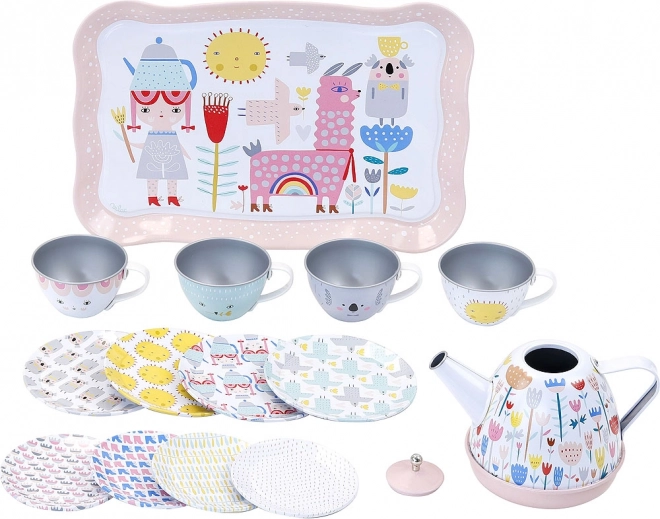 Sve je uredno spremljeno u čvrstom koferčiću, pa djeca mogu ponijeti svoju čajanku bilo kamo – u goste, u vrt ili na piknik. Kompletni 14-dijelni metalni set sadrži sve što je potrebno za čarobne čajanke.