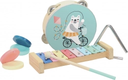 Set sadrži sve potrebno za mali kućni orkestar: šareni ksilofon s palicom, tamburin s medićem, jasno zvoneći trokut i par udobnih kastanjeta. Zahvaljujući ergonomskom oblikovanju, instrumenti dobro leže u malim rukama i motiviraju djecu na glazbenu igru.