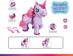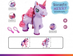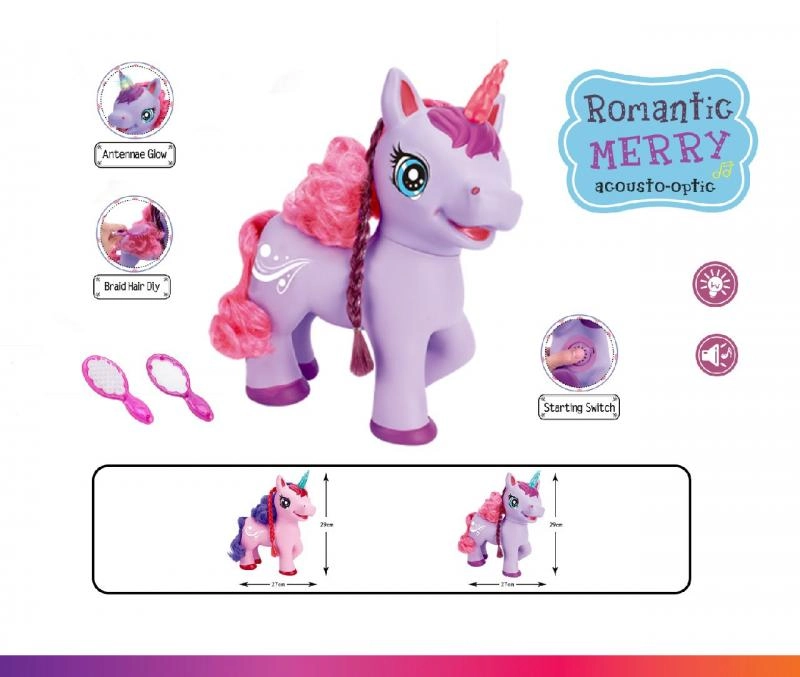 Slatki ljubičasti jednorog na baterije razveselit će djecu svojim efektima – nakon pritiska gumba na trbuščiću počinje pjevati pjesmu na engleskom, proizvodi čarobne zvukove i njegov rog svijetli. U kompletu su češljić i ogledalce za češljanje duge grive.