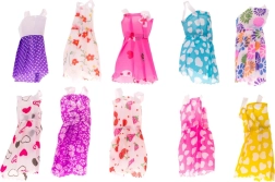 Set uključuje haljine u različitim bojama i uzorcima, uključujući točkice, srca i cvjetiće, idealne za kreativno izražavanje prilikom odijevanja lutaka.