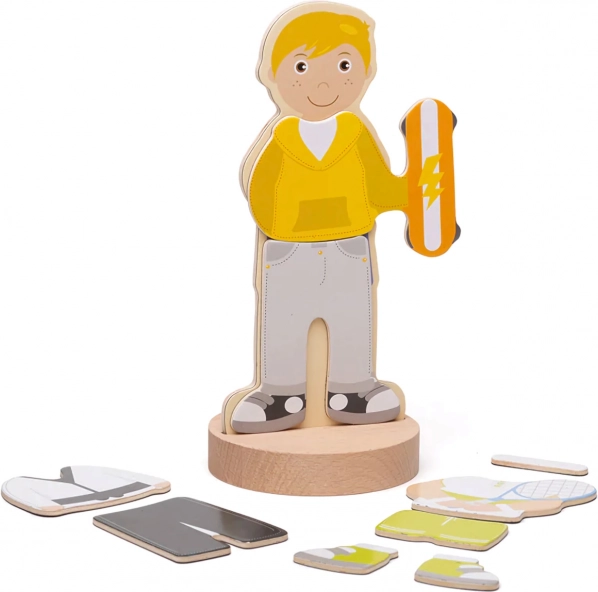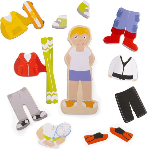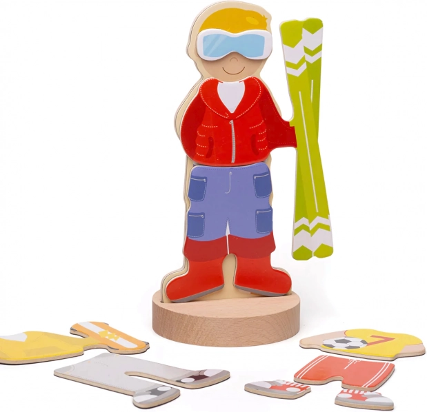 Potaknite dječju maštu s magnetskom odijevajućom slagalicom Bigjigs Toys. Djeca mogu pomoću magnetskih dijelova brzo mijenjati izgled lika i stvarati vlastite priče. Set nudi 7 različitih sportskih outfita, praktično skladištenje u čvrstoj kutiji s magnetskim poklopcem i izrađen je od kvalitetnih, odgovorno nabavljenih materijala. Igračka razvija kreativnost, finu motoriku i koordinaciju oko–ruka.