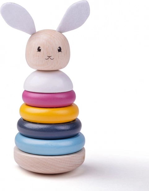 Ova kvalitetna drvena slagalica u pastelnim bojama idealna je prva edukativna igračka. Djeca slažu prstenove od najvećeg do najmanjeg, jačaju koordinaciju oko–ruka i uče razlikovati boje i oblike. Tekstilne uške i repić zeca dodaju taktilnu dimenziju igri.