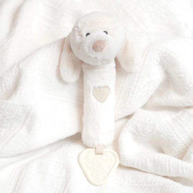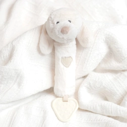 Ova višenamjenska mekana igračka u obliku psića nudi djeci tri doživljaja u jednom: nježno zveckanje za stimulaciju sluha, zabavno zviždanje pri pritisku i teksturiranu grickalicu za olakšanje kod nicanja zubića. Neutralan prirodni ton uklapa se u svaku opremu za bebe.