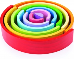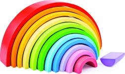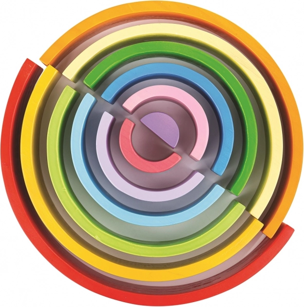 Velika drvena duga bezvremenska je edukativna igračka koja potiče otvorenu igru bez pravila. Djeca mogu lukove slagati, nivelirati, povezivati i kombinirati s drugim građevnim setovima – mogućnosti su gotovo beskrajne. Zahvaljujući robusnoj izradi i glatkoj površini, s dugom je ugodno rukovati, a odolijeva svakodnevnoj igri.