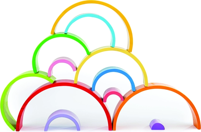 12 šarenih lukova nudi beskrajne kombinacije – od mostova i tunela do apstraktnih konstrukcija. Poticanje mašte i samostalne igre.