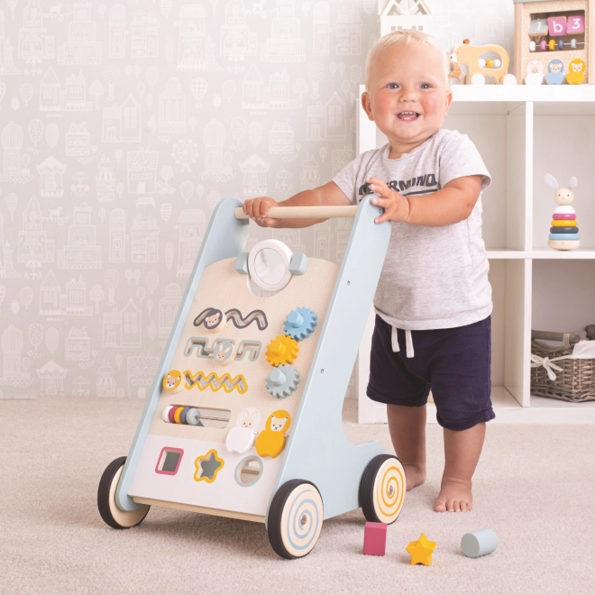 Drvena aktivna hodalica za djecu s razigranim elementima, potiče motoričke vještine, izrađena od FSC certificiranog drva.