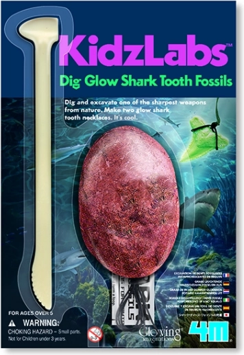 Sadrži 2 zuba morskog psa koji svijetle u mraku, izlivena u gipsanom bloku, poseban alat, konopac i upute.