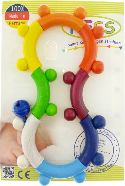 Ova kvalitetna drvena igračka namijenjena je najmlađima od rođenja. Zahvaljujući ugodnom obliku i površinama prirodno potiče hvat, trenira koordinaciju oko–ruka i razvija finu motoriku. Vizualno privlačne boje i zveckajući elementi potiču na istraživanje i igru.