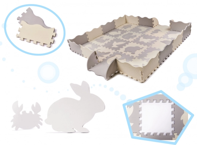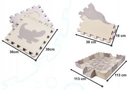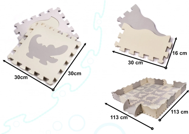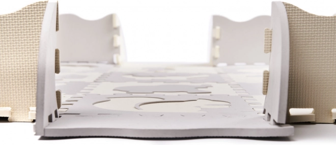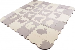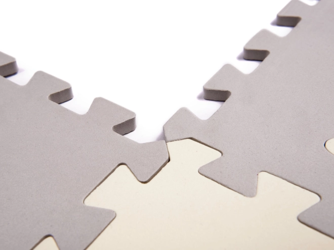 Meka dječja podloga od pjenastih puzzli s izvadivim oblicima stvara siguran i kreativan prostor za igru. Zahvaljujući povišenim rubovima može se složiti ogradica koja zadržava igračke unutra. Podloga je vodootporna, ima protukliznu površinu i odlično ublažava udarce, stoga je idealna za prve korake. Neutralna siva i ecru boja uklapa se u svaki interijer.
