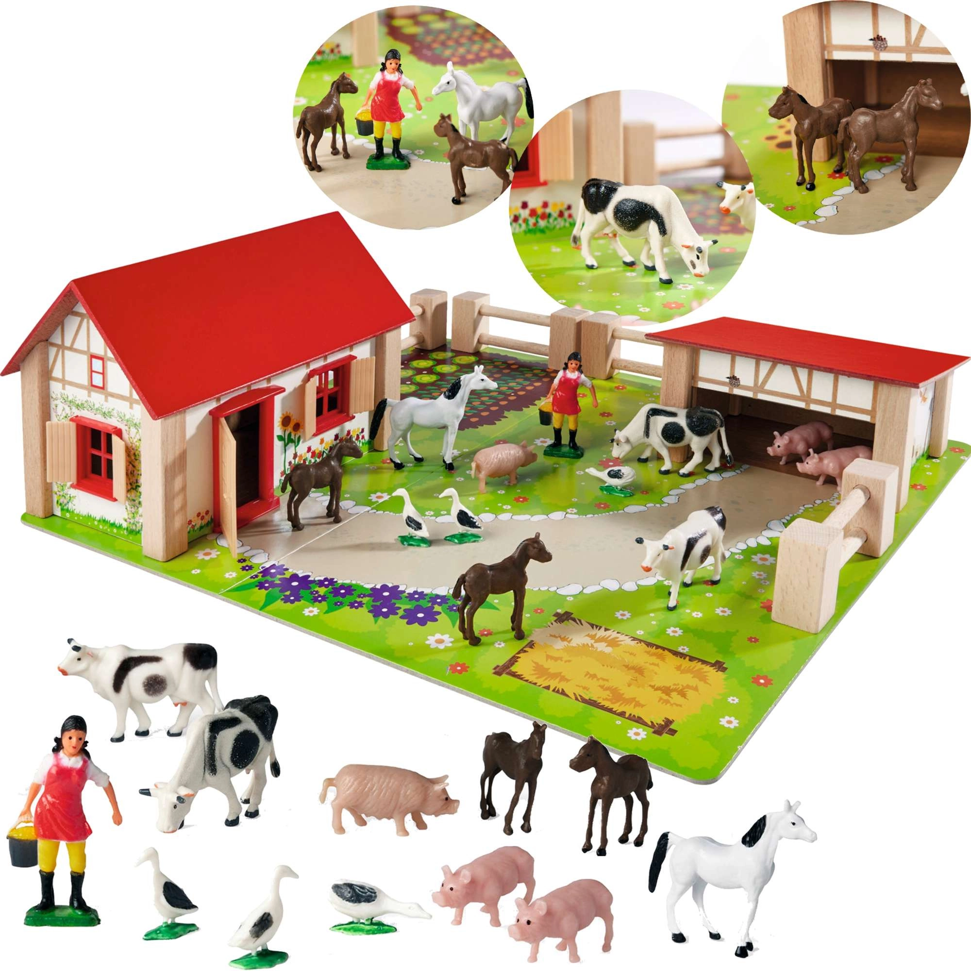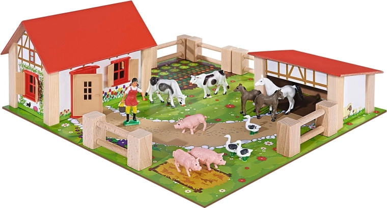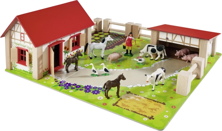 Drvena farma EICHHORN razveselit će svakog malog farmera. Set sadrži kućicu s crvenim krovom, štalu, ograde i detaljne figurice životinja uključujući konjiće, kravice, praščiće i guske. Dio seta je i šarena podloga sa stazama i vrtom koja djecu lako navodi na stvaranje vlastitih scena i priča. Čvrsta drvena konstrukcija i izdržljivi materijali osiguravaju dugi vijek trajanja i sigurnu igru.