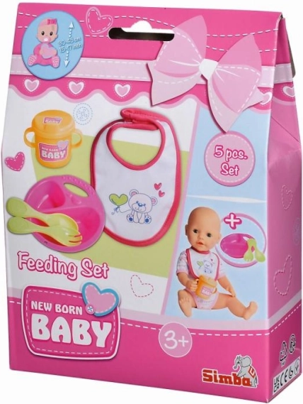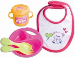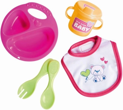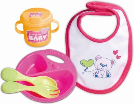 Slatki set za hranjenje za lutke NEW BORN BABY sadrži 5 dijelova – tanjur, žličicu, vilicu, šalicu i podbradnik – za lutke 30–43 cm. Lagani i lako se čisti set idealan je za igru hranjenja i razvoj fine motorike.