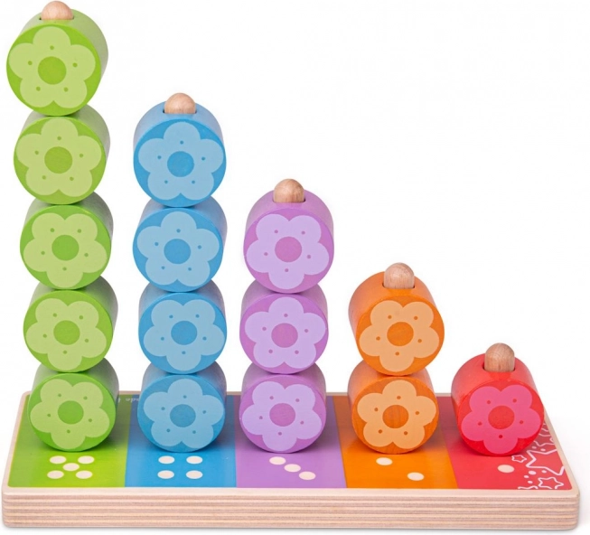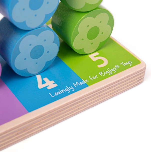 Vesela edukativna drvena igračka koja djecu uči razlikovati boje, brojati od 1 do 5 i trenirati finu motoriku. Šareni cvjetići lako se stavljaju na numerirane klinove, što potiče koordinaciju oko–ruka i koncentraciju. Izrađeno od kvalitetnog drva i u skladu s europskim sigurnosnim standardima.