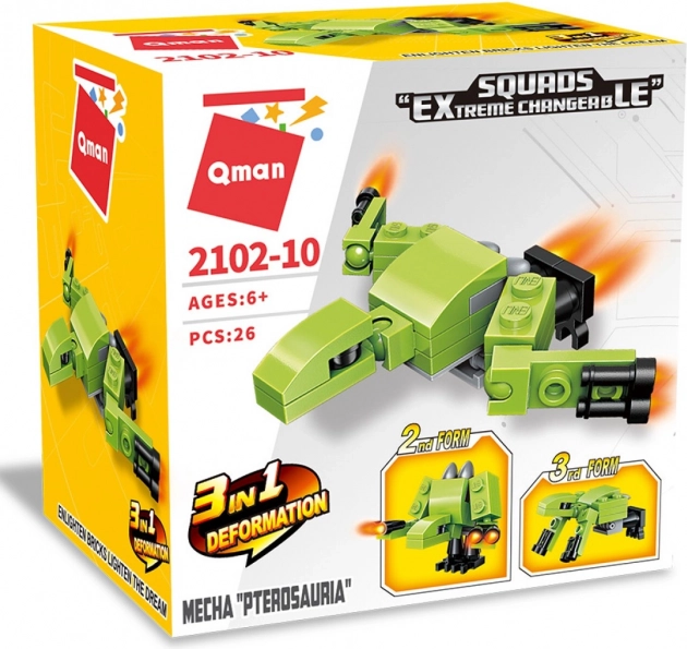 Građevni set Qman Mecha Pterosauria 3u1 idealan je za male entuzijaste kockica i modeliranja. Djeca mogu birati iz triju sastavljivih modela, ili stvoriti vlastite jedinstvene konstrukcije. Ova igračka izrađena je od kvalitetne i izdržljive ABS plastike, što jamči njezinu dugotrajnost.