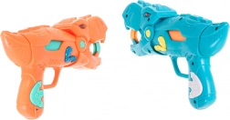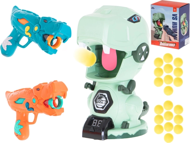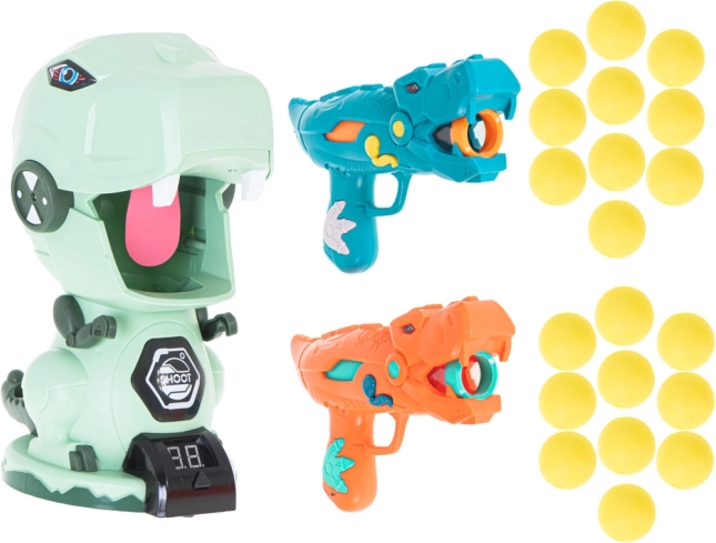 Dva stilizirana pištolja u obliku dinosaura omogućuju pucanje mekanim pjenastim kuglicama sigurno i učinkovito. Idealno za igranje u parovima i natjecanja.