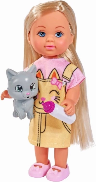 Slatka lutkica Evi Love u haljinici s mačjim printom razveselit će sve male ljubitelje životinja. U pakiranju se nalazi figura mačića i bočica za hranjenje za igru brige i njege. Dva različita izgleda – šaljemo nasumično, cijena je za 1 komad.