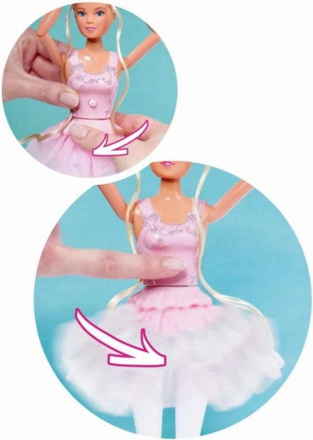 Lutka Steffi Love – plešuća balerina donosi elegantan baletni doživljaj u dječju sobu. Stilizirani top sa sjajnim detaljima i ružičasta tutu suknja stvaraju očaravajući izgled, dok gumb u obliku ruže pokreće rotaciju suknjice za efekt pravog nastupa.