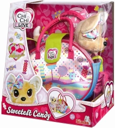 Preslatki chihuahua CHI CHI LOVE iz edicije Sweetest Candy razveselit će svako dijete stilskom torbicom u obliku slatkiša, praktičnom naramenicom i razigranim privjescima. Psić od mekane plišane tkanine visok je 20 cm, idealan za maženje i putovanja te odlično potiče empatiju. Savršen poklon za djecu od 3 godine nadalje.