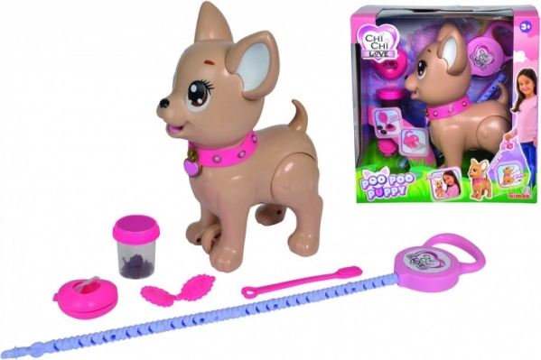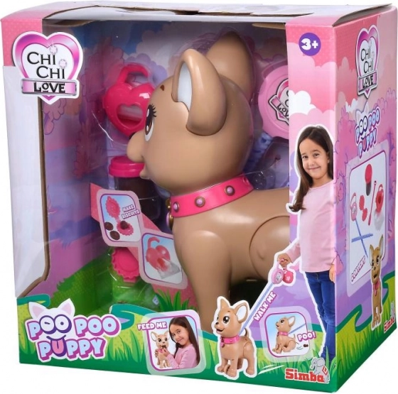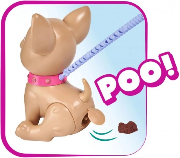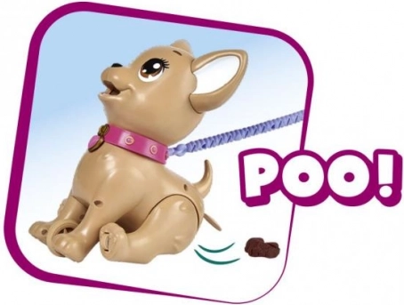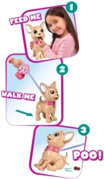 Interaktivni psić čivava Poo Poo od CHI CHI LOVE donosi djeci realističnu, a istovremeno sigurnu igru brige o ljubimcu. Napravite poslasticu od modeline, nahranite psića i krenite u šetnju – nježnim pritiskom na povodac psić savija stražnje nožice i napravi hrpicu, koju je lako počistiti uz priložene vrećice.