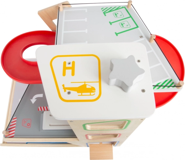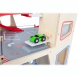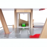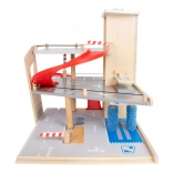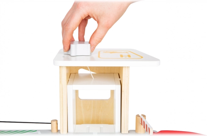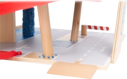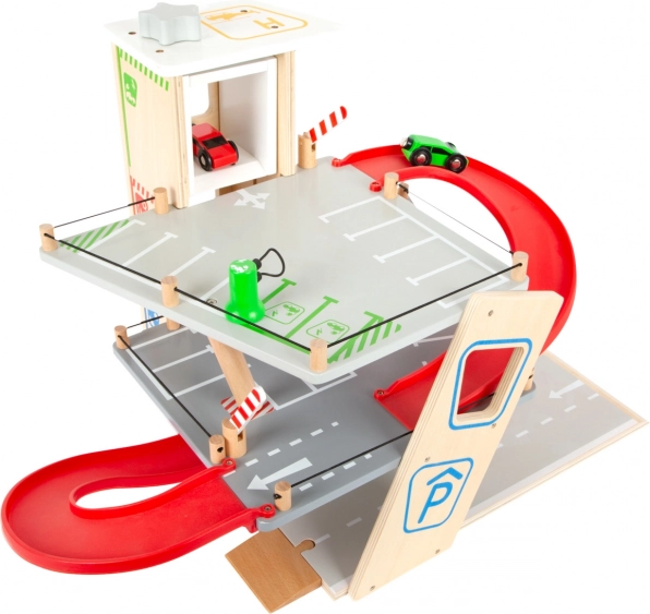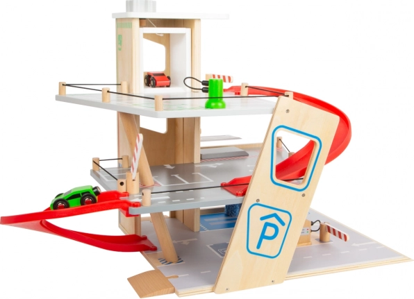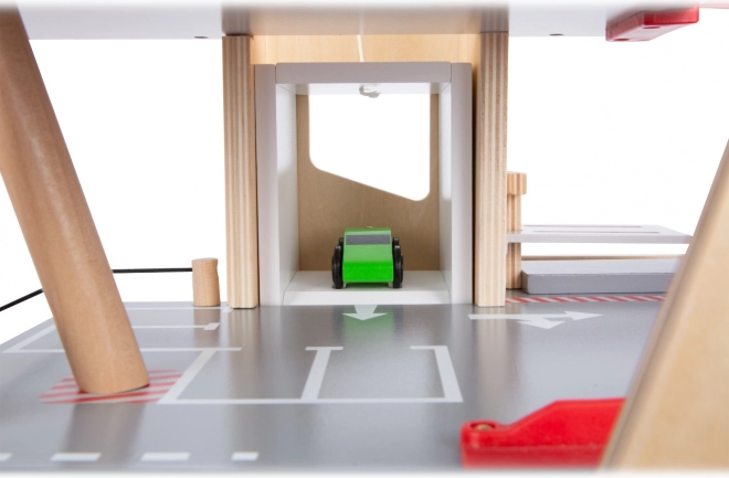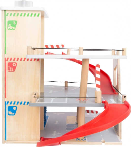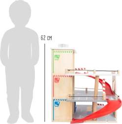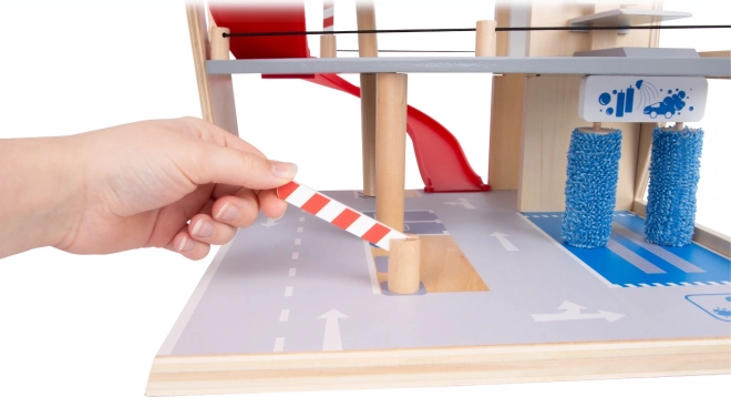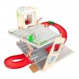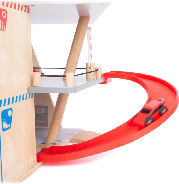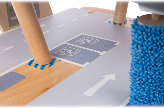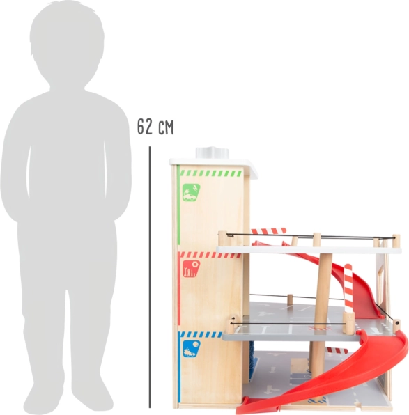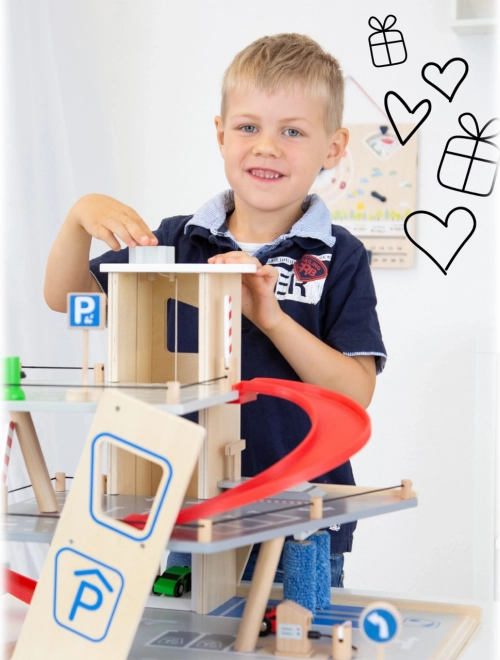 Otkrijte robusno drveno parkiralište s tri kata, funkcionalnim dizalom i glatkim rampama za beskrajnu igru autićima. U kompletu su dva auta, benzinska postaja, punjač za električna vozila, dizač vozila, realistična autopraonica s četkama i mehaničke rampe/barijere na svakom katu. Sigurnu vožnju osigurava gumena zaštitna ograda, a detaljna signalizacija razvija prometnu svijest.