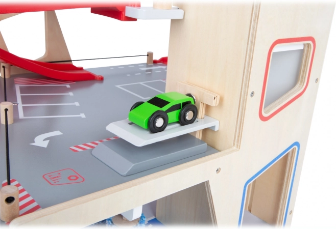 Ovo premium parkiralište od kvalitetne drvene šperploče nudi tri bogato opremljena kata povezana funkcionalnim dizalom i dvjema glatkim rampama. Djeca mogu parkirati, točiti gorivo, puniti, prati i popravljati – sve na jednom mjestu, s realističnim elementima i izvrsnom igrivošću.