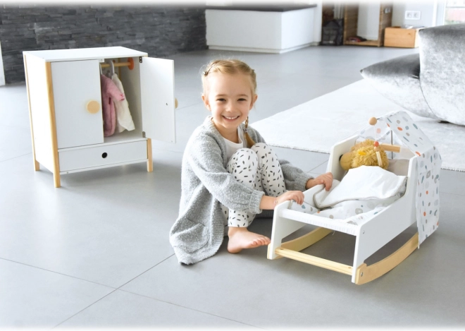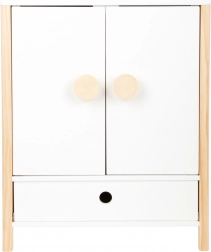 Izdržljiva drvena konstrukcija, stabilna izrada i sigurni, zaobljeni rubovi osiguravaju ugodnu i sigurnu igru. Ormarić potiče samostalnost, osjećaj za red i razvija maštu u igri brige o lutkama.