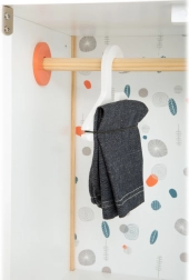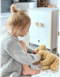 Ovaj stilski ormarić za lutke iz linije Little Button spaja čiste linije, prirodne materijale i funkcionalnu unutarnju organizaciju. Djeca imaju sve nadohvat ruke: vješalicu s ramenicama za vješanje haljinica, uklonjive police za dodatke i prostranu ladicu za sitnice. Minimalistička izvedba s nježnim tonovima prirodno se uklapa u moderan interijer.