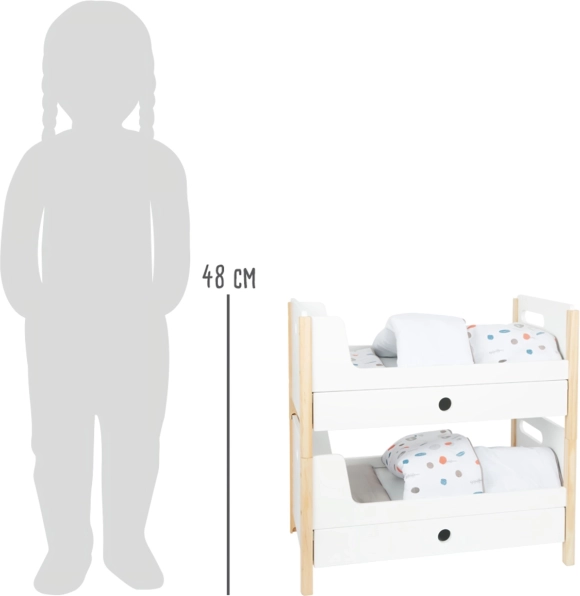 Dio pakiranja je posteljina u neutralnim bojama i oversized popluni koji udobno smještaju lutke ili plišance do 46 cm. Ladice ispod svakog kreveta nude pametno spremište za odjeću i sitne dodatke. Idealan dodatak dječjoj sobi i stilskom kutku za lutke u okviru kolekcije Little Button.