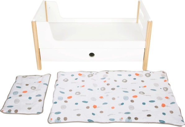 Ladice ispod kreveta održavaju red u dodacima, dok rodno neutralna posteljina i oversized popluni pristaju lutkama do 46 cm.