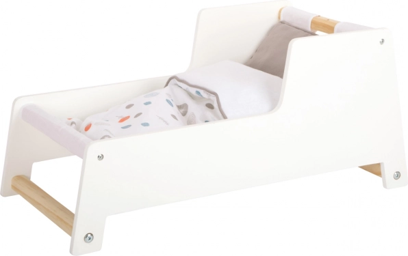 Stilska kolijevka za lutke u nordijskom stilu za djecu od 3 godine. Nudi stabilnu drvenu konstrukciju, zaobljene klizače za ljuljanje, lako uklonjiv baldahin i obostranu rodno neutralnu posteljinu. Pod velikom dekom udobno će spavati lutke i plišanci do 46 cm. Elegantne pastelne nijanse i zaobljeni rubovi savršeno se uklapaju u moderan dječji sobičak.