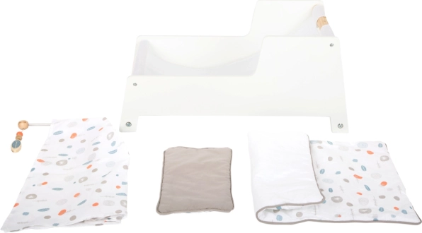 U kompletu je obostrana, neutralno usklađena posteljina i velika deka pod kojom se udobno smještaju lutke ili plišanci do 46 cm. Nježne boje i minimalističke linije čine je ukusnim dodatkom svakom interijeru te potiču kreativnu i imitativnu igru.