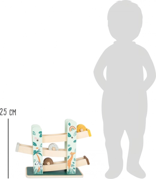 Ova prekrasna drvena staza omogućuje djeci da prate kako tri kolutića, svaki s jedinstvenim dizajnom, spuštaju niz tri rampe. Ukrašena je ilustracijama životinja koje žive na safariju i biljaka iz džungle.