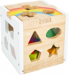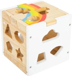Ova moderna drvena umetaljka SMALL FOOT ističe se čistim izgledom prirodnog drveta u kombinaciji s bijelim panelima i šarenim dijelovima. Djeca u otvore umeću oblike poput kruga, zvijezde, trokuta, križa, oblaka ili kućice, čime na zabavan način vježbaju finu motoriku i logičko razmišljanje.
