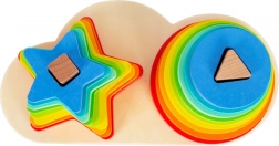 Toranj za slaganje Duha Duo je drvena igračka dizajnirana za podršku učenju i razvoju djece. Nudi mogućnost slaganja dijelova prema veličini i obliku - zvjezdica i krugova - u sjajnim bojama. Ova igračka stimulira prepoznavanje boja i koordinacijske sposobnosti, dok djeca kroz igru slažu dugu.