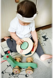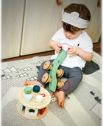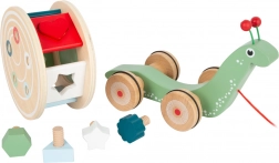 Predstavljamo vam simpatičnog drvenog puža na uzici, koji ne samo da će zabaviti, već i pomoći u razvoju vašeg djeteta. Zahvaljujući svojoj lakim pokretima i lako rotirajućim kotačima idealan je za djecu koja počinju hodati i potiče njihovu koordinaciju i ravnotežu. Puž također služi kao sortir s pet različitih oblika, što potiče kognitivne sposobnosti i finu motoriku.