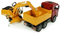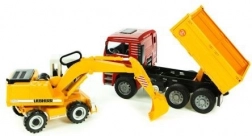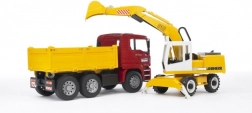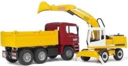 Ovaj sjajni građevinski set tvrtke Bruder uključuje MAN TGA kamion s mekim gumama i praktičnom kiper karoserijom. Uz njega dolazi i funkcionalni bager Liebherr koji se ističe stabilizacijskim potpornim nogama, profiliranim gumama i žlicom s kabinom koja se okreće za 360°. Proizvod je kvalitetno izrađen u Njemačkoj od izdržljivih materijala.