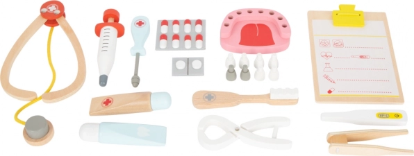 Ova dječja liječnička torbica nudi mnogo prilika za igru i učenje. Sadrži drvene alate poput šprice, četkice, bušilice, kliješta i modela zuba. Djeca mogu postati mali zubari i naučiti osnove dentalne higijene kroz zabavnu igru.
